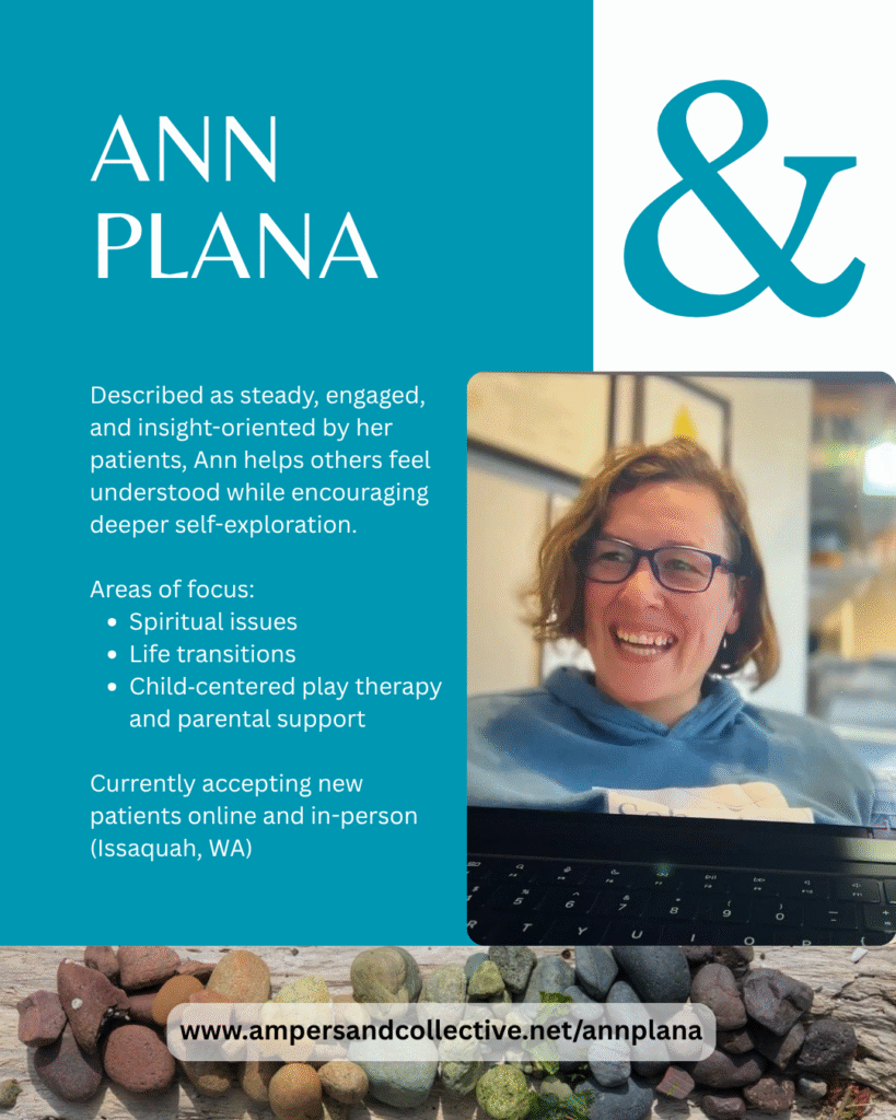 Described as steady, engaged, and insight-oriented by her patients, Ann helps others feel understood while encouraging deeper self-exploration. Her areas of focus include: spiritual issues, life transitions, child-centered play therapy and parental support. Ann is currently accepting new patients online and in-person (Issaquah, WA) Read more about Ann or schedule a free consultation: www.ampersandcollective.net/annplana