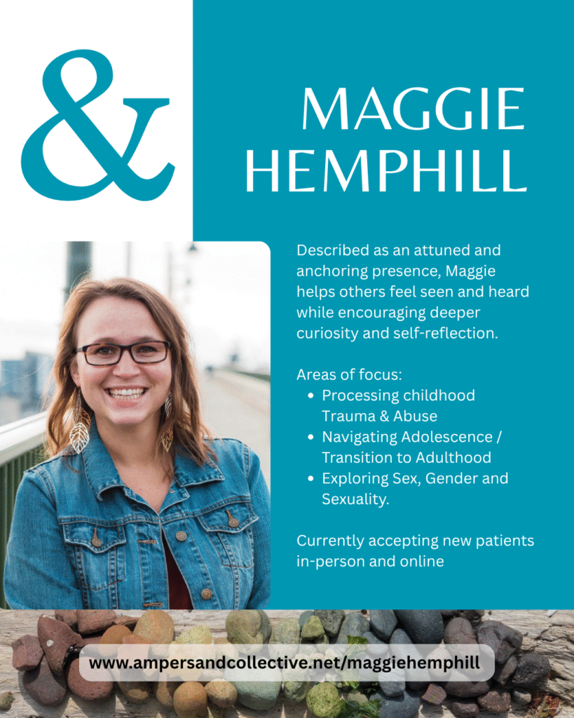 Maggie Hemphill, LMHCA is described as a highly attuned and anchoring presence. Maggie helps others feel seen and heard while encouraging deeper curiosity and self-reflection. Maggie’s areas of focus include: processing childhood trauma & abuse, navigating adolescence / transition to adulthood, and exploring sex, gender and sexuality. Maggie is currently accepting new patients in-person and online. Read more about Maggie or schedule a free consultation: www.ampersandcollective.net/maggiehemphill
